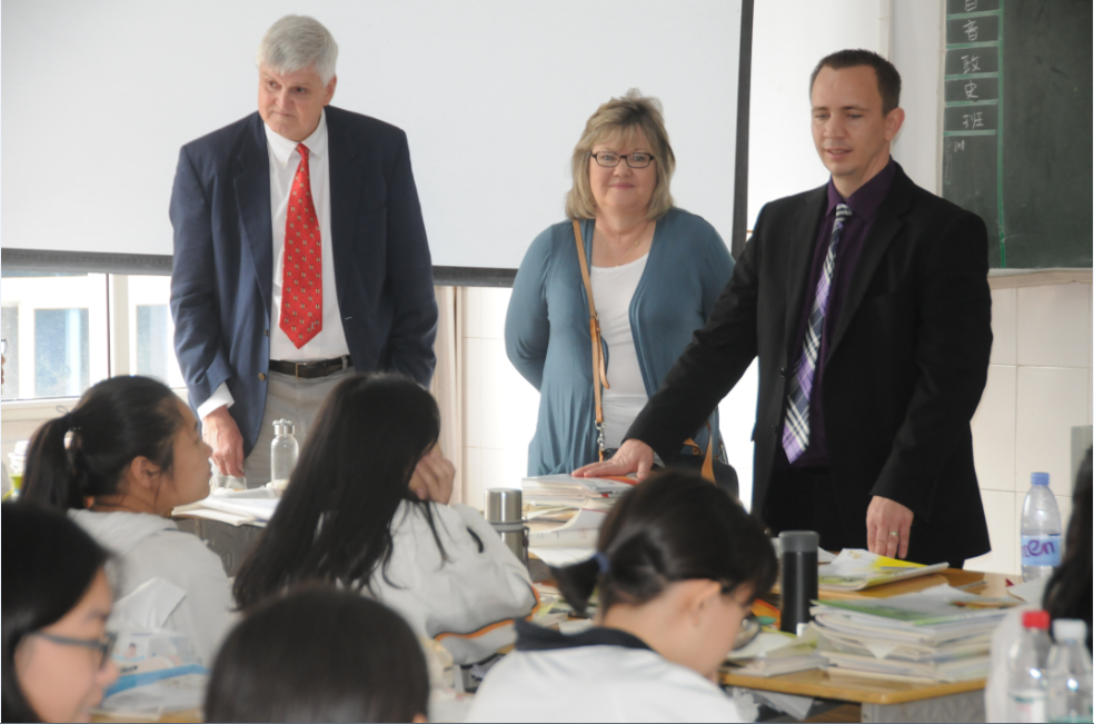 10月25日上午,在国际交流处、教科所负责人带领下,美国乔治福克斯大学教育学院院长Marc Shelton及代表团等一行15人到我校教育硕士联合培养基地岳阳市第一中学进行课堂观摩。