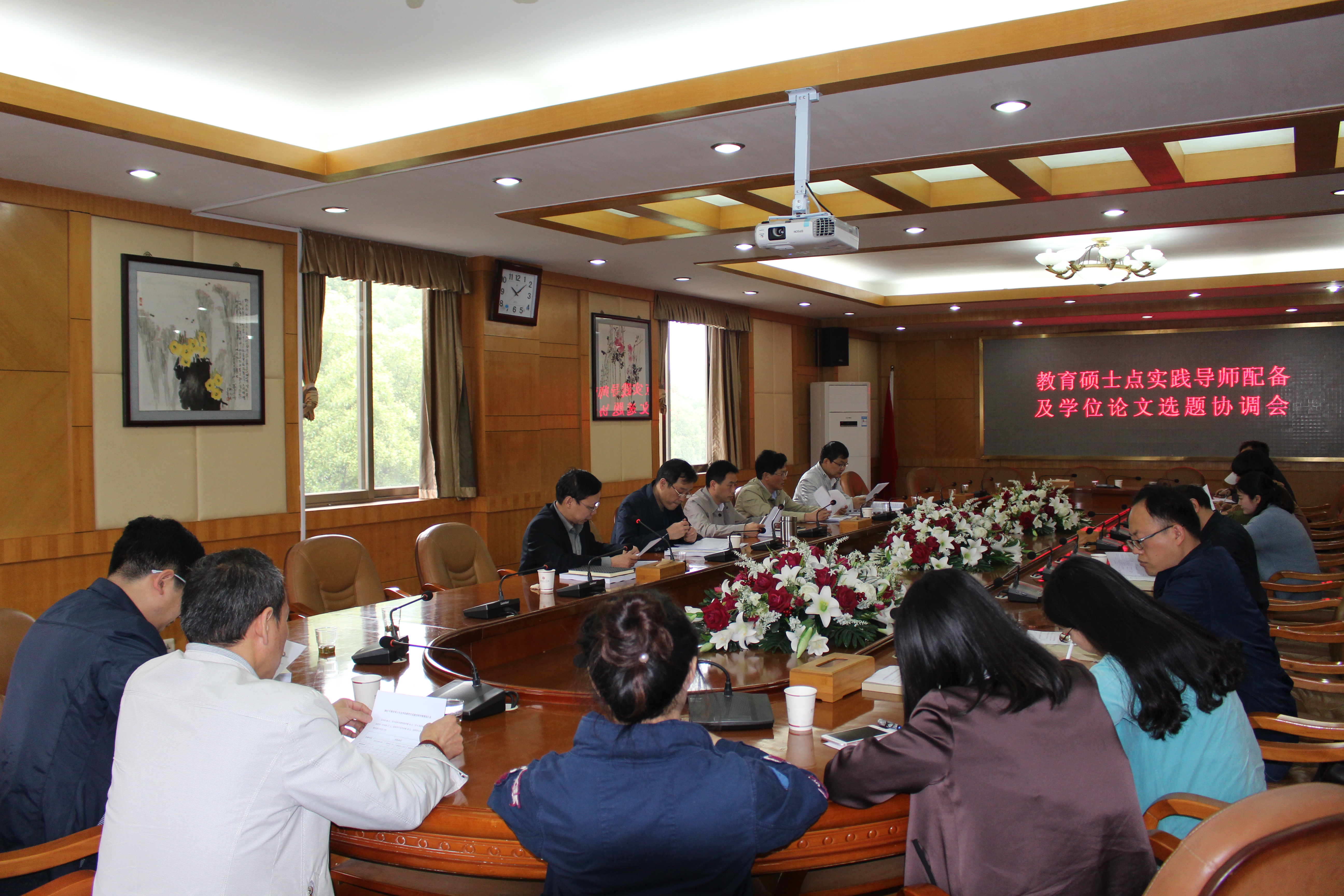 为深入推进我校教育硕士培养工作,4月26日上午在319会议室召开了教育硕士实践导师配备及学位论文选题协调会,会议由张国云副校长主持,教科所、研究生处相关人员,各培养领域相关负责人参加。