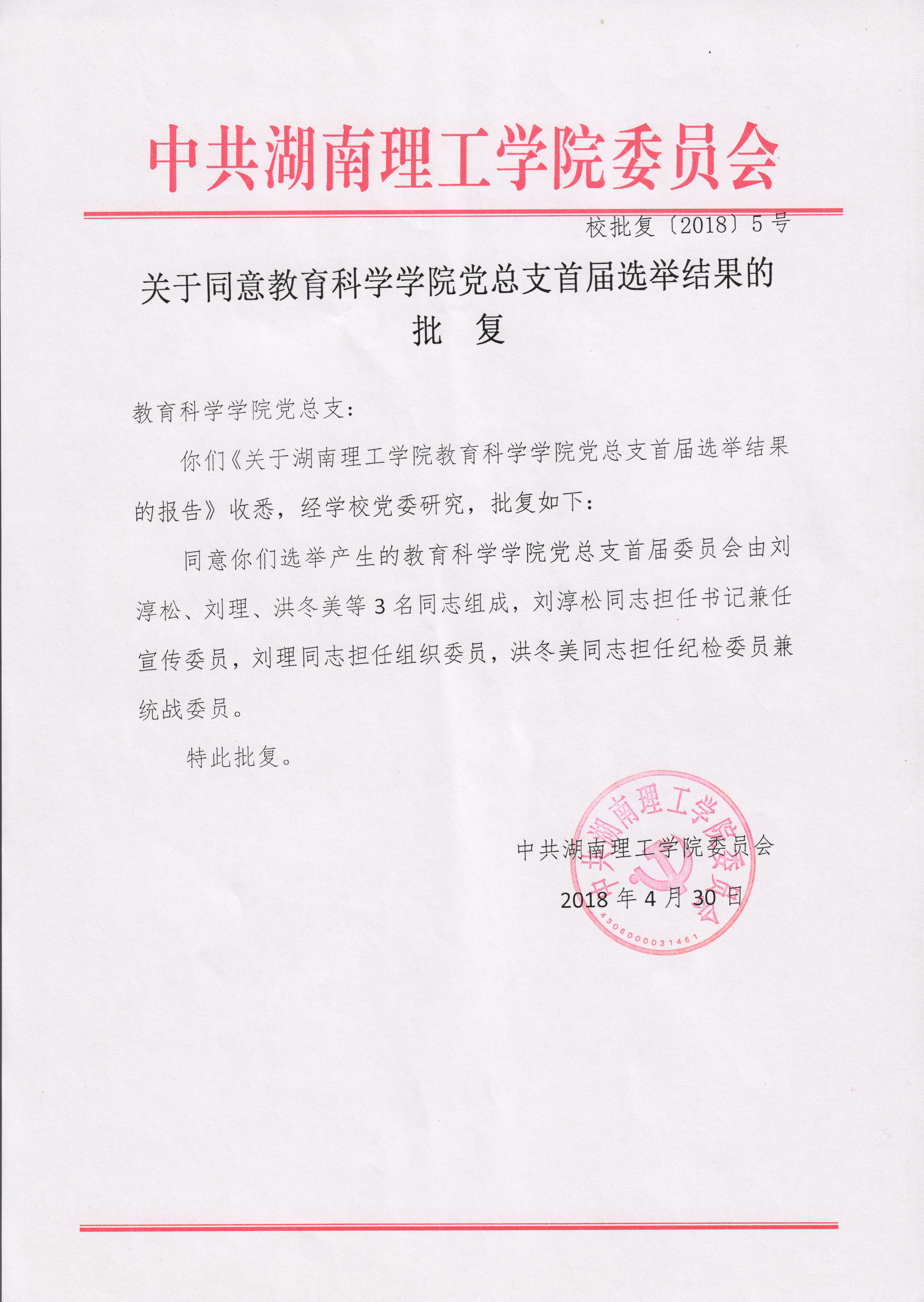 校党委4月30日印发的《关于同意教育科学学院党总支首届选举结果的批复》