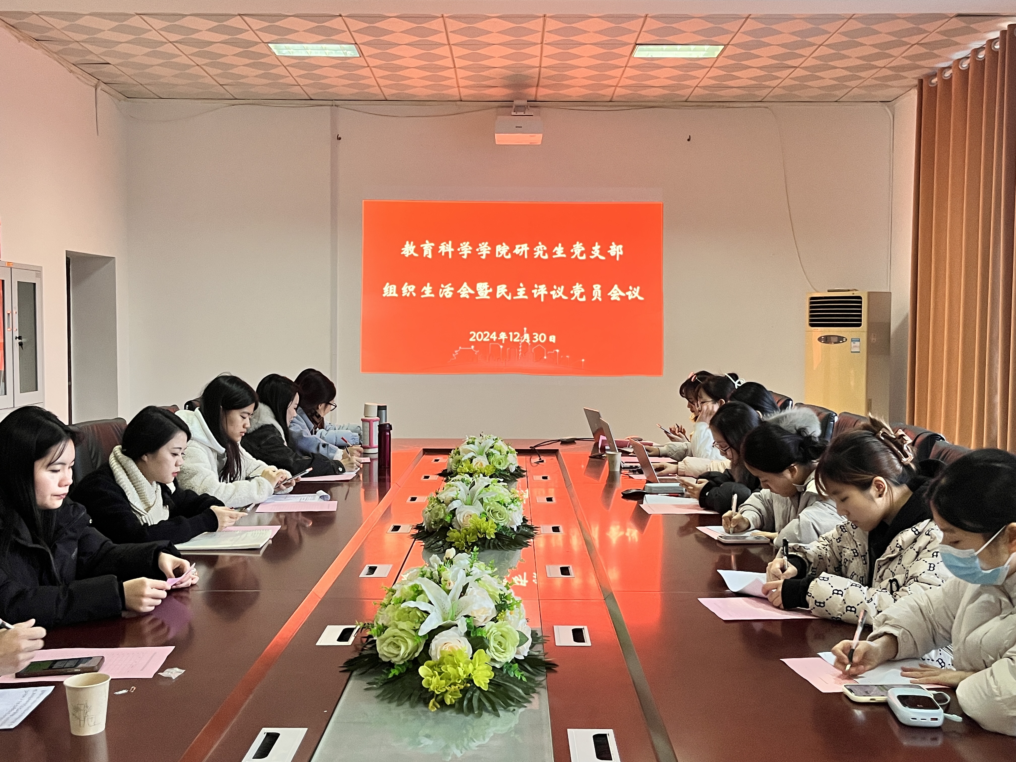 2024年12月30日上午9:00,学院研究生党支部在综合楼1305会议室召开2024年度双述双评会议暨组织生活会与民主评议党员会议。学院党总支书记钟坚与会并作工作点评,研究生党支部书记王炜向全体与会党员述职,党支部副书记李思情主持会议。