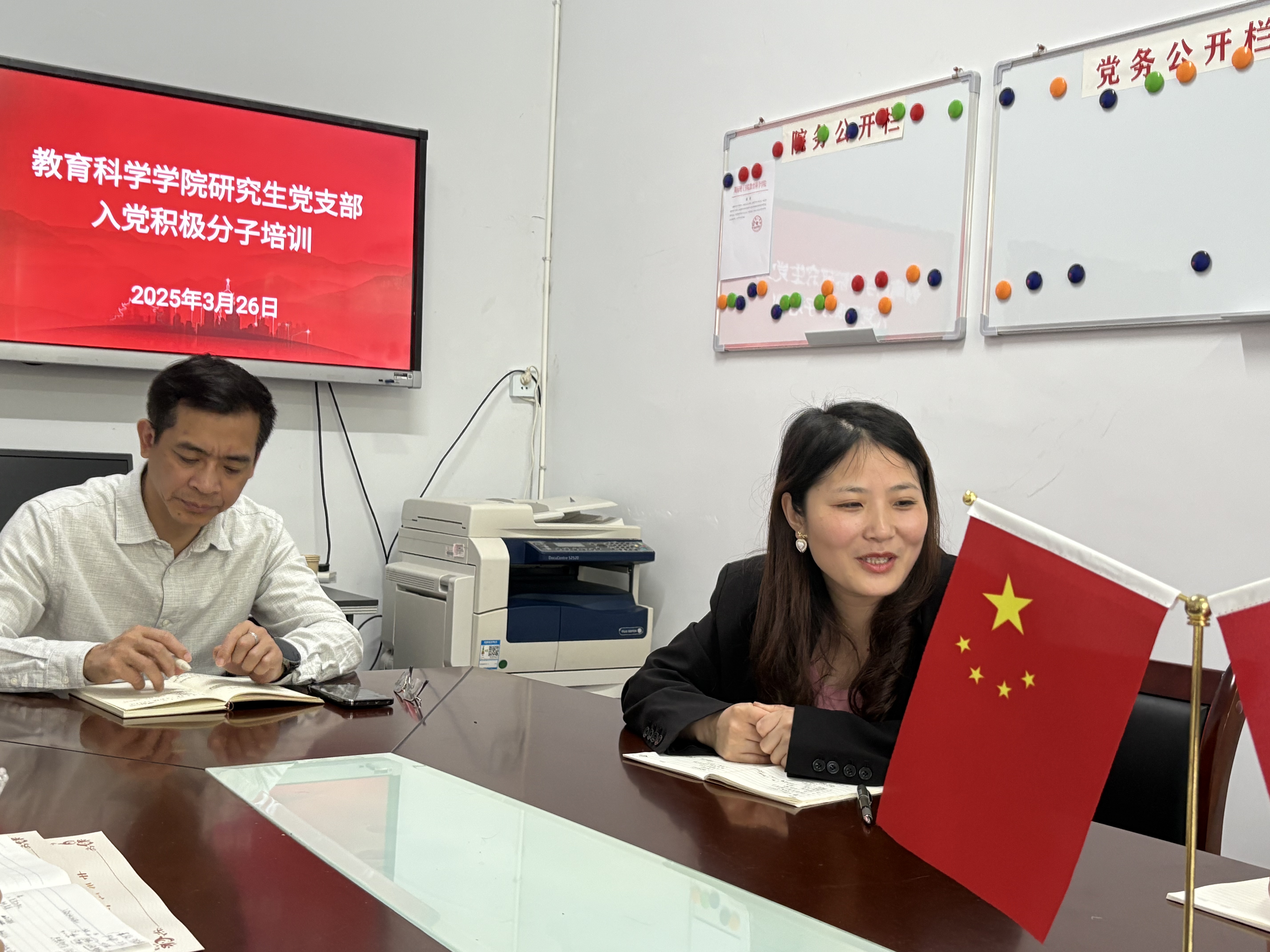 为推动支部党员队伍建设,夯实入党积极分子思想根基,厚植爱党爱国情怀,明晰学习纪律要求,3月26日上午,教育科学学院研究生党支部在综合楼312会议室开展入党积极分子培训。学院党总支书记钟坚、研究生党支部书记王炜、全体入党积极分子参加。