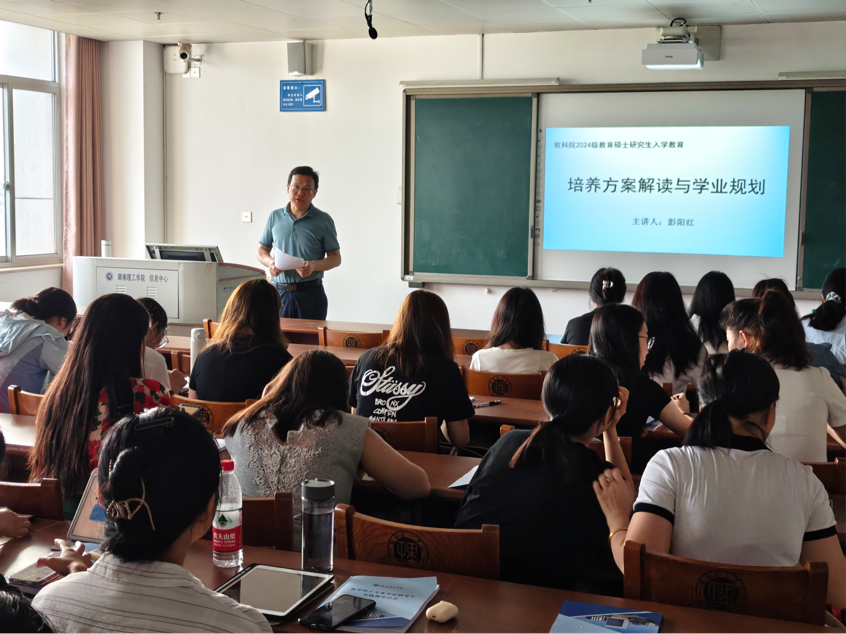 2024年9月14日上午8点,教育科学学院2024级研究生新生入学教育在12号教学楼12506教室进行。主持行政工作的彭阳红副院长给新生解读培养方案及学业规划。2024级全体研究生参加。
