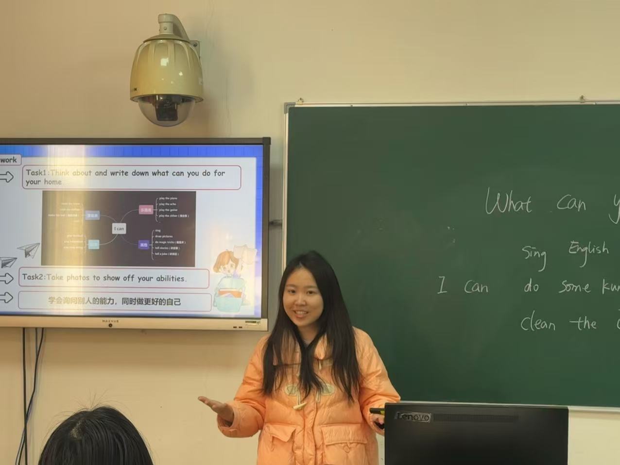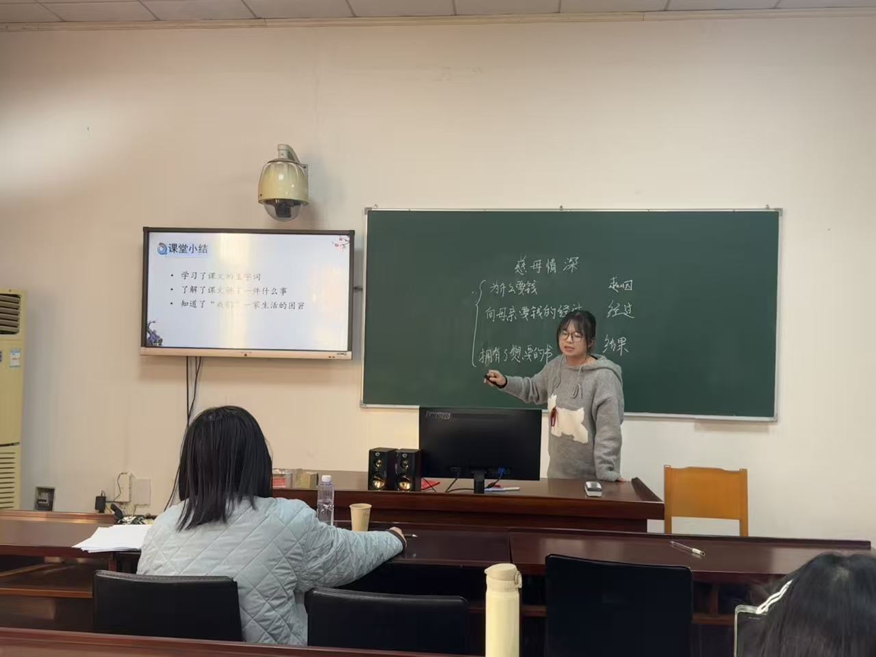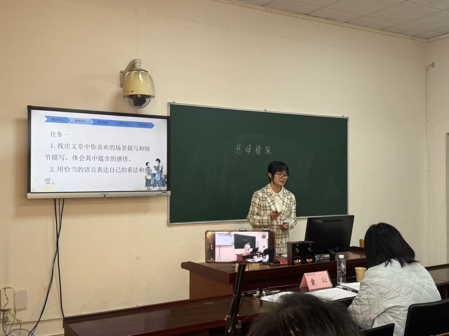 考核以片段教学展示为主要形式,重点考察学生在教学目标设定、内容组织、教学方法、教学仪态等方面的综合能力展示中同学们各展所长:彭松媛通过启发性提问高效突破教学重难点;韩纤纤的英语课堂生动活泼感染力强。卢仪数学讲解生动具体,逻辑清晰。语文教学展示中,熊留燕讲授《一个粗瓷大碗》,巧妙引入博物馆讲解情境,深入浅出地引导学生理解文本;谭雪莲执教《登鹳雀楼》,在古诗讲解中嵌入朗读指导,帮助学生体会诗人情感意境;杨洁和邱钰涵分别从不同维度解读《慈母情深》邱钰涵则从生字词入手,步步深入,引导学生感悟“慈母情深”的内涵;刘慧琳则以富有亲和力的语言带领学生感受《走月亮》的审美意境