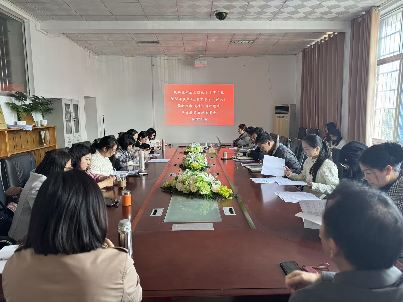 3月12日下午,我院在1号教学楼1305会议室召开党总支理论学习中心组2026年第3次集中学习(扩大)暨部署启动树立和践行正确政绩观学习教育会议。学院班子成员及全体师生党员参加。