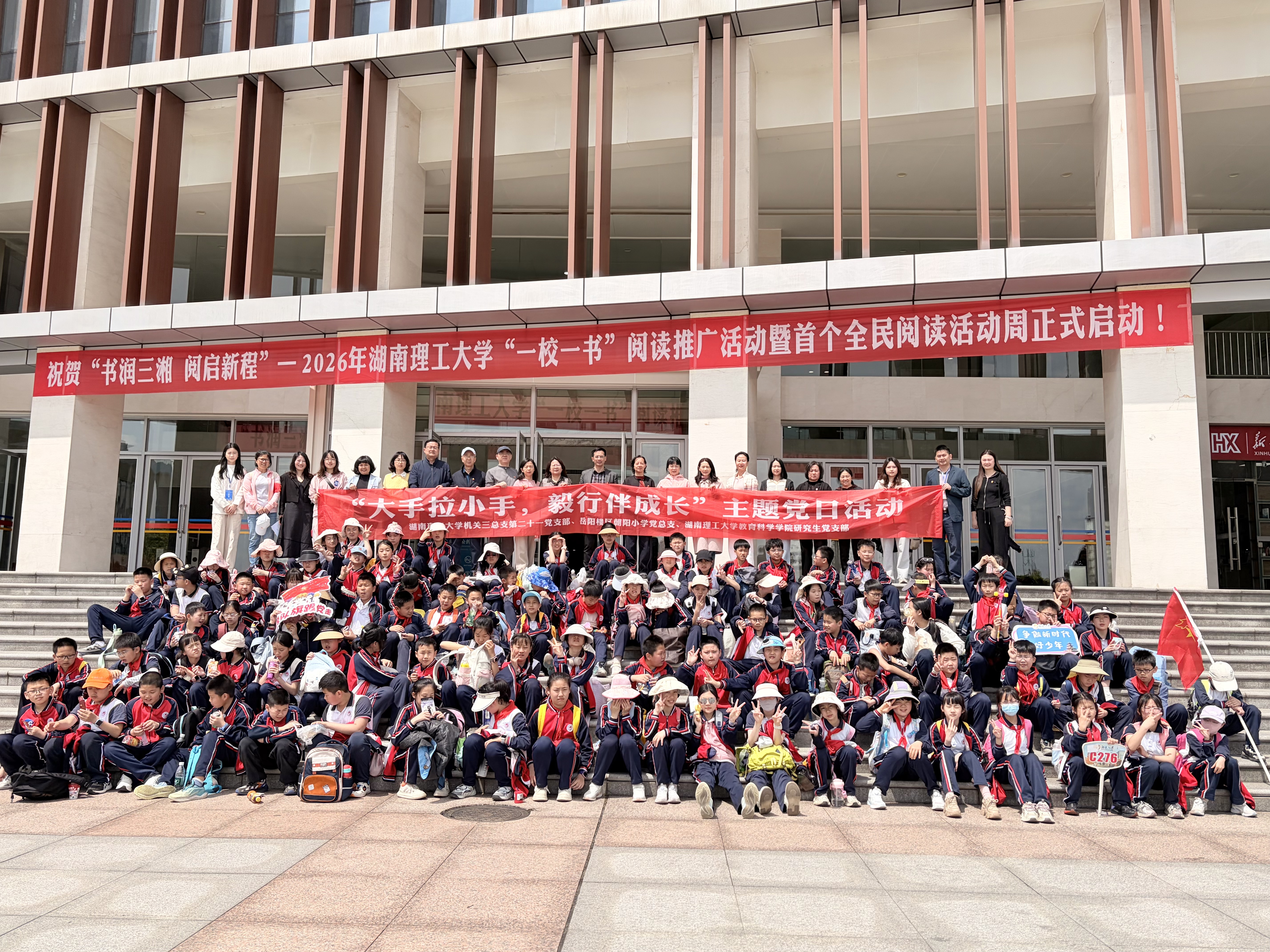 为深入贯彻习近平文化思想,推进“大中小学思政一体化”,响应全国首个“全民阅读活动周”活动倡议,4月24日,湖南理工大学机关三总支第二十一党支部(图书馆党支部)、教育科学学院研究生党支部携手岳阳楼区朝阳小学党总支,共同开展 “大手拉小手,研途伴成长”沉浸式研学实践活动。