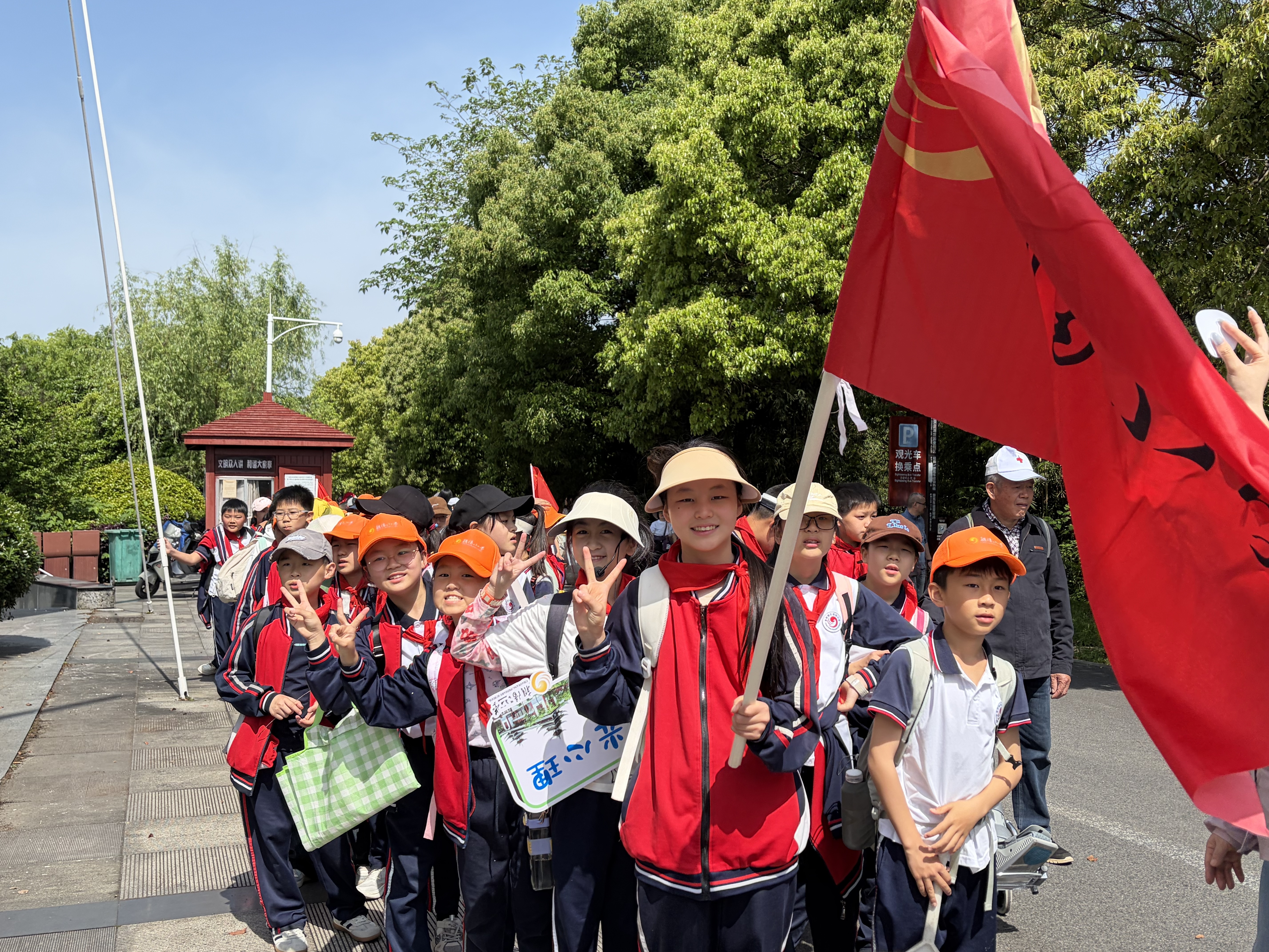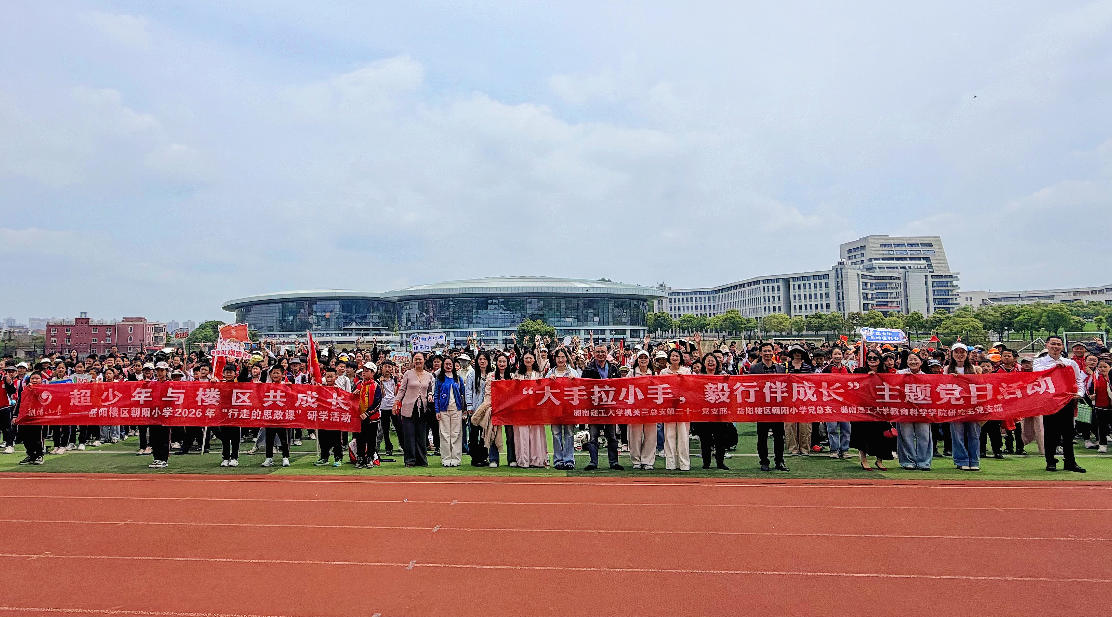 在20余名党员教育硕士志愿者的全程护航下,朝阳小学700余名师生走进湖南理工大学校园,近距离感受高校文化氛围,开启趣味研学之旅。活动当天,校园内氛围热烈,师生们热情相会、有序漫步校园,志愿者与小学各班级一一结对、结伴同行。活动采取分场并行模式,一路师生走进图书馆,在图书馆负责人陈近的讲解下,近距离感受高校浓厚的书香氛围;另一路师生在田径场开展主题读书活动,全体肃立奏唱国歌,党员重温入党誓词、少先队员重温入队誓词,随之以诗词吟诵、红色故事分享、文化体验等环节浸润经典文化。活动尾声党员志愿者们为孩子们送上明信片、定制书签等纪念礼品,传递温暖与期许。