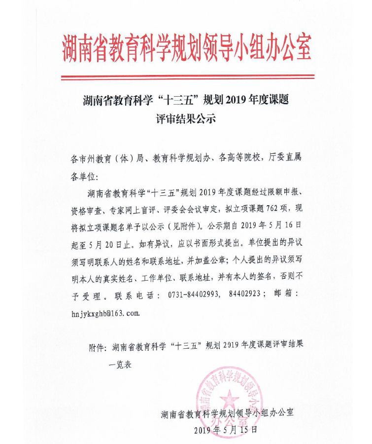 湖南省教育科学“十三五”规划2019年度课题评审结果公示