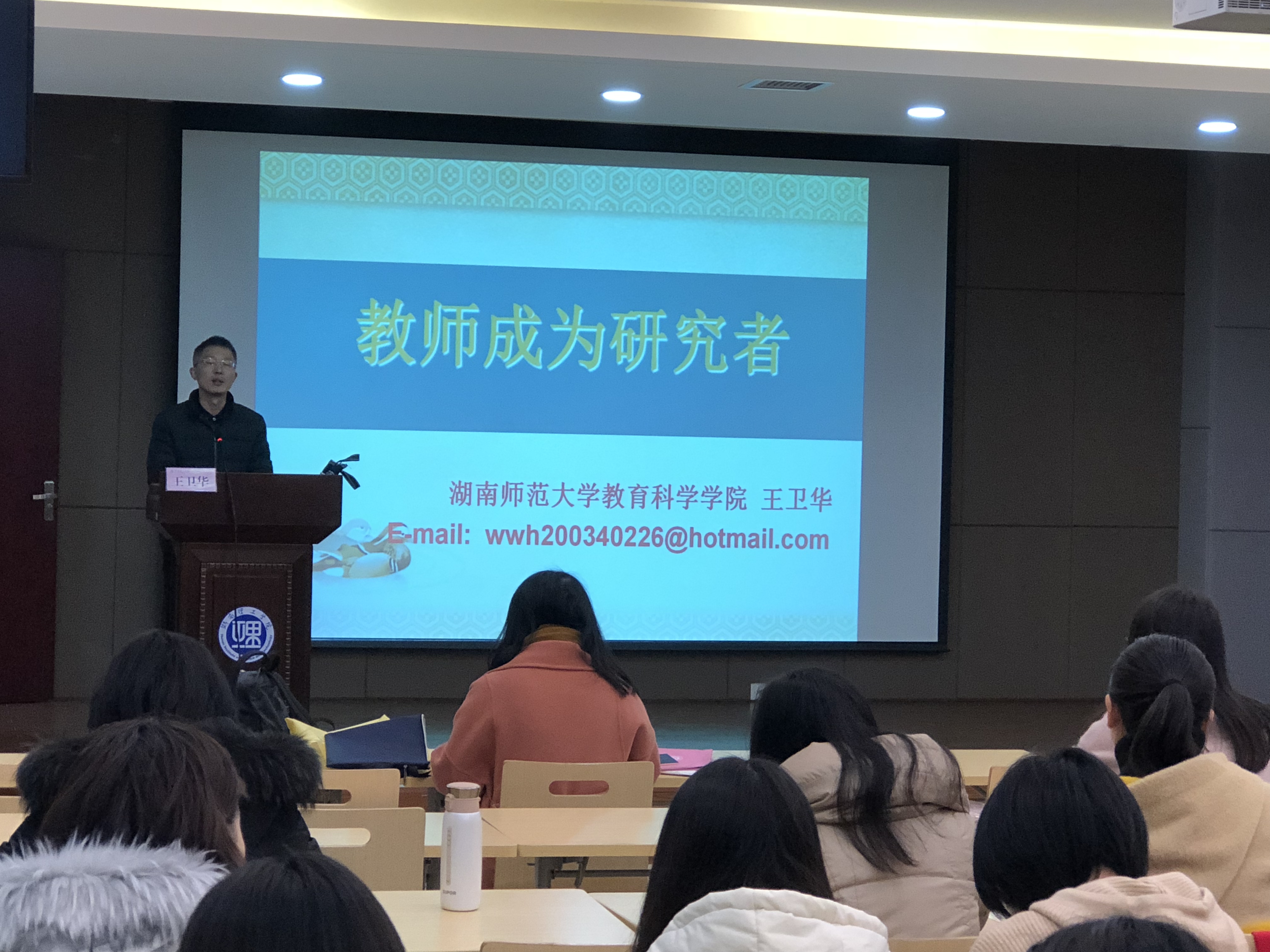 “不思,故无惑;不求,故无得。教师成为研究者,不但不是负担,反而是权利,甚至是福利”。12月7日上午,由教育科学学院主办的“滨湖师范讲堂”第二十一讲在南院新图书馆一楼多功能报告厅举行。本讲特邀湖南师范大学博士生导师王卫华教授主讲。yL23411永利集团官网登录研究生辅导员王炜主持讲座,全体2018级教育硕士研究生参加。