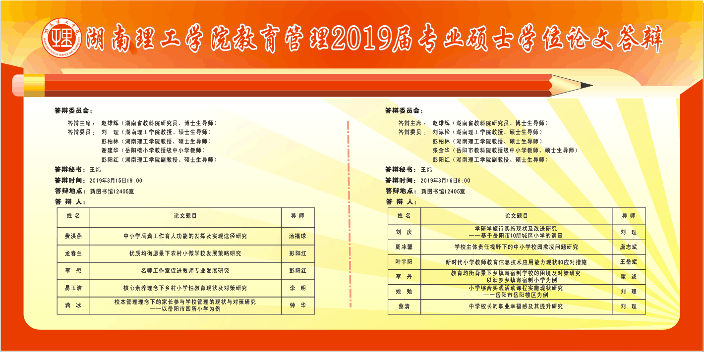 3月15日晚上和3月16日上午,教育科学学院举行2019届教育管理专业硕士研究生学位论文预答辩。学院邀请湖南省教育科学研究院副院长赵雄辉研究员担任本次预答辩委员会主席,岳阳市教育科学与技术研究院张金华研究员,岳阳楼小学谢建华教授,我校期刊社彭柏林教授,我校yL23411永利集团官网登录刘理教授、刘淳松教授、彭阳红副教授担任此次预答辩评委。