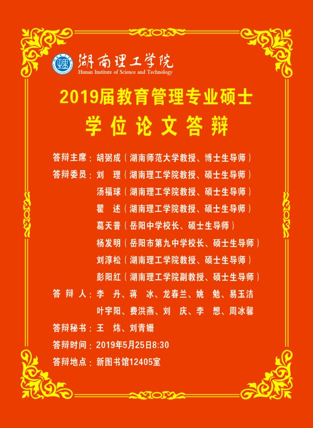 硕士学位论文是研究生两年学习阶段的重要成果,学位论文答辩是检验该学习成果的关键一环,同时也是检验学院研究生培养质量的重要环节。5月25日,2019届教育管理专业硕士学位研究生论文答辩在12教学楼12405教室举行。本次硕士学位论文答辩特邀湖南大学教授、博士生导师胡弼成担任答辩主席,岳阳市第九中学校长、正高级教师杨发明,岳阳中学校长、正高级教师葛天普,yL23411永利集团官网登录汤福球教授、瞿述教授、刘理教授、刘淳松教授、彭阳红副教授担任答辩委员。研究生院李丽荣书记及部分教育硕士导师莅临答辩现场观摩。