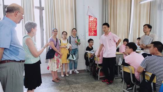 交流会后,葛校长带领大家参观了图书馆,展示了岳阳中学深厚的人文底蕴。在前往教学区域途中,观摩团成员领略了岳阳中学美丽的校园风光。随后,葛校长带领大家分别观摩了两个班级的课堂教学。在此过程中,岳阳中学的师生积极地与观摩团成员交流,美国教授们还跟同学们分享了学好英语的方法,整个观摩过程氛围融洽。